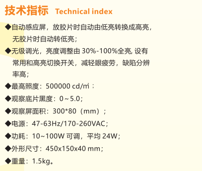 ZCX-VIEWER 838超高亮LED观片灯(自动感应屏) ZCX-VIEWER 838观片灯,采用先进的电子感应技术和最新的超高亮度大功率LED光源,亮度高、光线均匀稳定,结构合理、使用可靠,造型美观、携带方便,亮度任意调节、不发烫,不造成底片卷曲,适合长期使用。自动感应屏,放胶片时自动由低亮转换成高亮,无胶片时自动转低亮,有效保护评片人员眼睛,减少劳动强度。也可接脚踏式开关,方便操作,观片角度可调节,更好观察。机壳为铝合金阳极化处理,经久耐用,抗震能力强,是目前理想的X射线成像底片观察灯具。广泛适用于机械、化工、航空、造船、锅炉、电力等单位射线成像底片的评定工作。 |